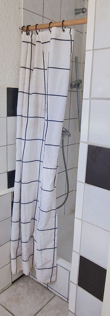 Das Badezimmer ist funktional gestaltet, die Dusche etwas kompakt, bietet aber Gestaltungsmöglichkeiten für eine modernere Lösung.